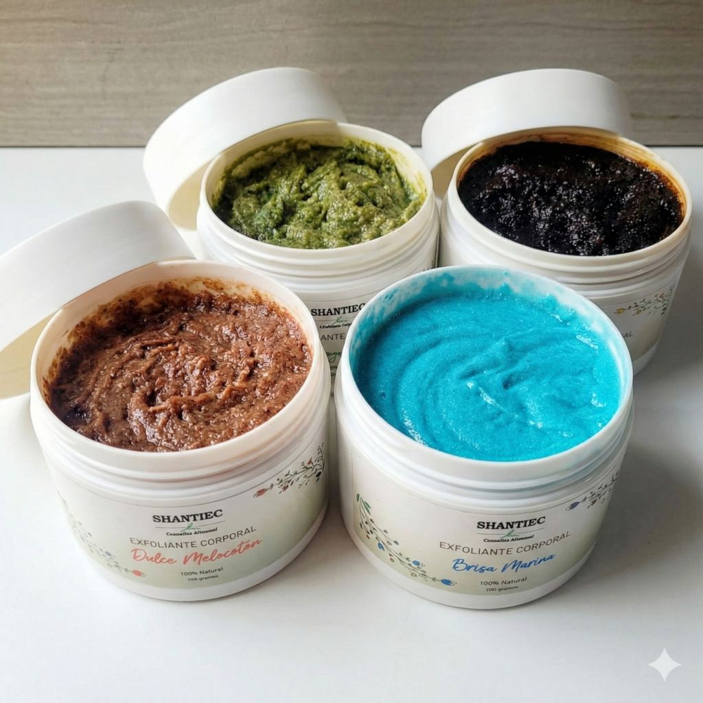 Exfoliante SHANTIEC elaborado con ingredientes 100% naturales, para eliminar suavemente las células muertas logrando que la piel quede limpia ,lisa y suave.